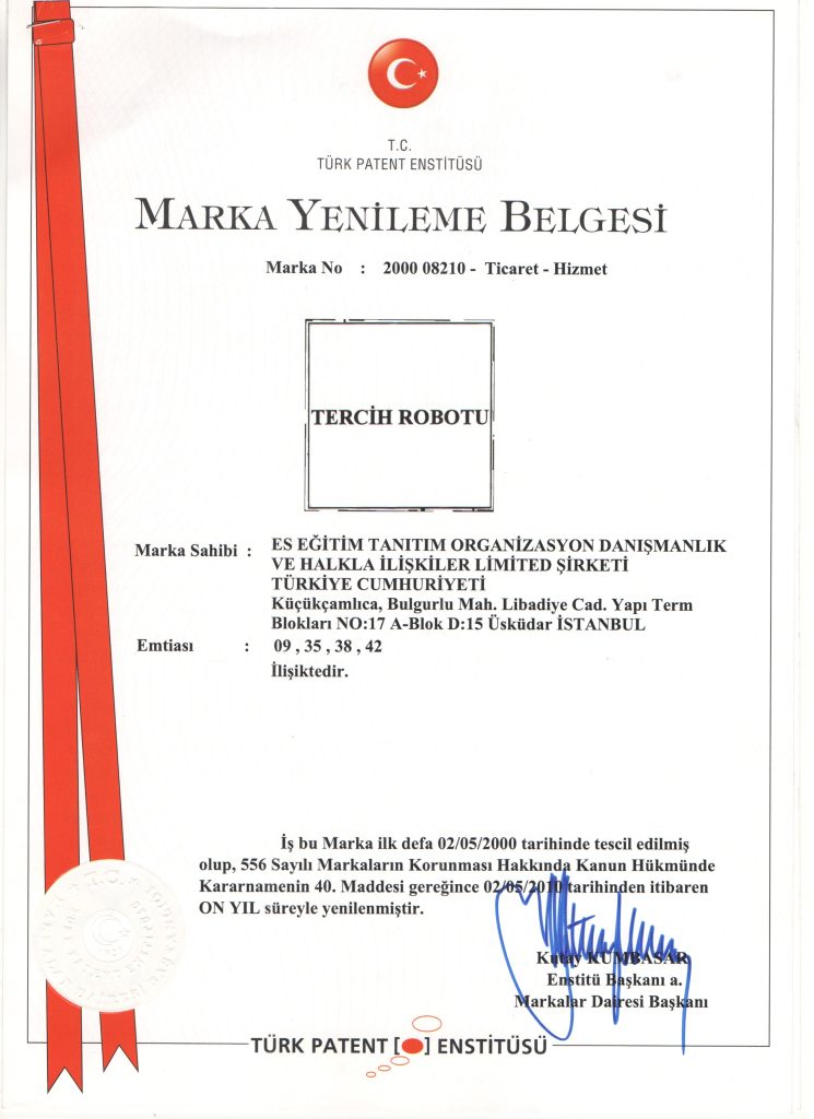 TERCİH ROBOTU MARKA TESCİL BELGESİ :